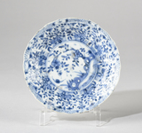 Soucoupe à assise annulaire, parois évasées, lèvre légèrement ondulée, au décor bleu-blanc consistant au fond en un médaillon figurant un paysage dans lequel se distingue un rocher ajouré, au contour déchiqueté, encadré de fleurs, un oiseau en vol ; sur le marli, tiges florales et insectes (?) alternant avec une fleur isolée formant des compartiments légèrement sinueux ; sur la lèvre, ligne brisée ; tiges florales en face externe.