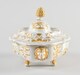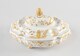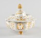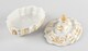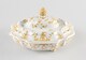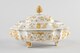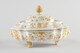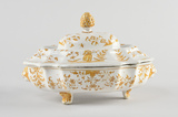 Soupière tripode de forme ovale chantournée au décor jaune constitué d’un double liseré sous la lèvre, de motifs floraux sur le corps, deux anses en bouton à têtes de lion ou de griffon, voir anthropomorphe à coiffe (?) de part et d’autre, pieds en forme de patte ; couvercle chantourné au bouton en forme de pomme de pin au décor jaune de grotesques à figure de joueur de violon, fillette et griffon sur fond de motifs floraux.