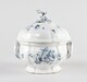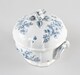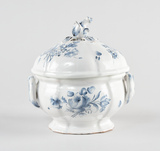 Soupière, pied individualisé, panse renflée godronnée, lèvre éversée, deux anses horizontales arrondies ornées d’une agrafe en leur centre, décor de bouquets de fleurs de part et d’autre. Couvercle hémisphérique godronné au même décor, préhension consistant en un bouton floral.