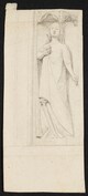 Représentation en pied d’une sculpture de sainte martyr, disposée dans une niche sur un piédestal. Elle porte le voile et une robe. Un dais architectural la surplombe. Ses attributs sont la coupe et le rameau, tenus chacun dans une main.