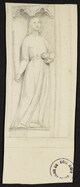 Représentation en pied d’une sculpture de sainte martyr, disposée dans une niche sur un piédestal. Elle porte une robe. Un dais architectural la surplombe. Ses attributs sont la coupe et le rameau, tenus chacun dans une main. Au verso, divers esquisses d’objets formant un panorama avec l’objet 2004.2.24 : un cloître, une façade de bâtiment, un manuscrit, un siège et une sépulture.