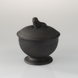 Sucrier, rond, sur pied individualisé, décor en relief de stries sur la panse, muni de son couvercle semi-sphérique au décor similaire et orné d’une frétel en forme de lion couché.