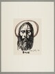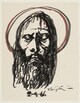 Tête de Christ, de face, barbue, auréolée, amaigrie, les yeux mi-clos.