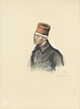 Soldat africain, à mi-corps de trois-quarts gauche, portant un uniforme noir et boutonné et coiffé d’un fez rouge avec un turban blanc.