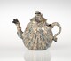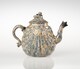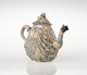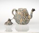 Théière avec couvercle.Théière à assise plate, bec tubulaire, au décor marbré polychrome (bleu, jaune, noir et marron) en forme de coquille ; couvercle ovale, au décor similaire, bouton de préhension représentant un lion couché.