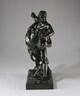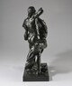 Le succès de sa production animalière, dont le traitement naturaliste magnifie les corps-à-corps âpres et frémissants, ne doit pas faire oublier ses nombreuses figures à sujets historiques ou mythologiques, comme dans cet épisode dans lequel Thésée, fils du roi d’Athènes, à l’issue d’un combat éprouvant mais solidement campé, s’apprête à transpercer le Minotaure vaincu. Le héros, nu à l’antique, au corps musculeux, à la chevelure stylisée maintenue par un bandeau, suspend son geste. La composition, opposant solidité du héros et déséquilibre de l’hybride cherchant à s’agripper à son adversaire, introduit tension dramatique et fort dynamisme. Promis à une mort certaine dans le labyrinthe destiné à abriter le Minotaure, fils de l’épouse du roi de Crète Minos, né de la vengeance de Poséidon à son encontre, il réussit à terrasser la bête. Ce bronze, provenant du legs de Jules Warnier-David, souligne la place de Barye au sein de la collection de Reims qui compte quatorze sculptures et deux paysages de l’artiste. [M. Julien, 2017]