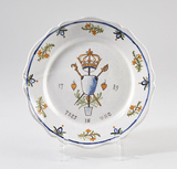 Assiette ronde, bord chantournée, au décor polychrome (doré, noir, bleu, vert) figurant au centre les trois ordres symbolisés par la couronne, l’épée, la crosse, la pelle placées dans une cuirasse, trois coeurs, palmes ; tiges florales, fleurs stylisées et liseré bleu sur l’aile.