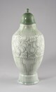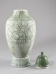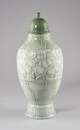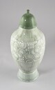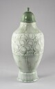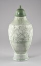 Vase à pied circulaire au bord évasé, panse globulaire, col resserré, à couvercle en cloche surmonté d’un bouton sphérique, décor constitué de cannelures sur le pied, de pampres stylisés sur la panse encadrés de motifs géométriques.