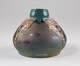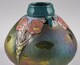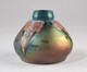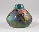 Vase piriforme, à assise annulaire, carène basse, col court, au décor émaillé consistant en trois motifs triangulaires descendant du col sur la panse figurant des tiges flroales, délimitant des plages mâtes à reflets métallescents ornées de fleurs or, col émailllé.