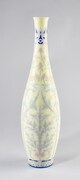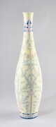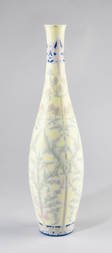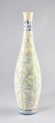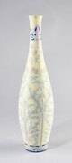 Grand vase de forme ovoïde, long col galbé, au décor vert, rouge et bleu sur fond jaune figurant des chardons stylisés.