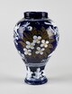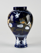 Vase balustre à base saillante, assise plate, pied individualisé, panse ovoïde à léger épaulement, col court rectiligne, au décor sur fond bleu persan blanc, jaune et vert fait d’oiseaux et d’insectes en vol entre des tiges florales ; sur le pied, dans un registre délimité par des filets, motifs de feuilles.