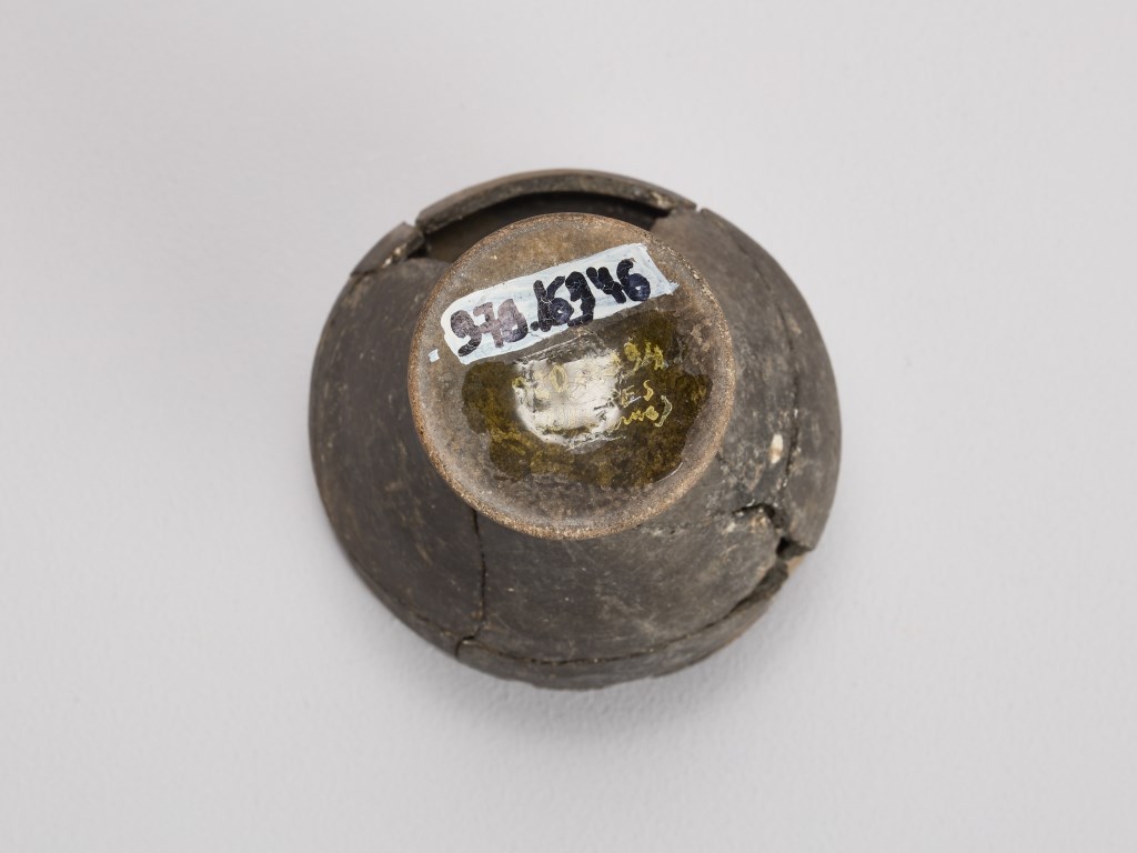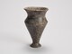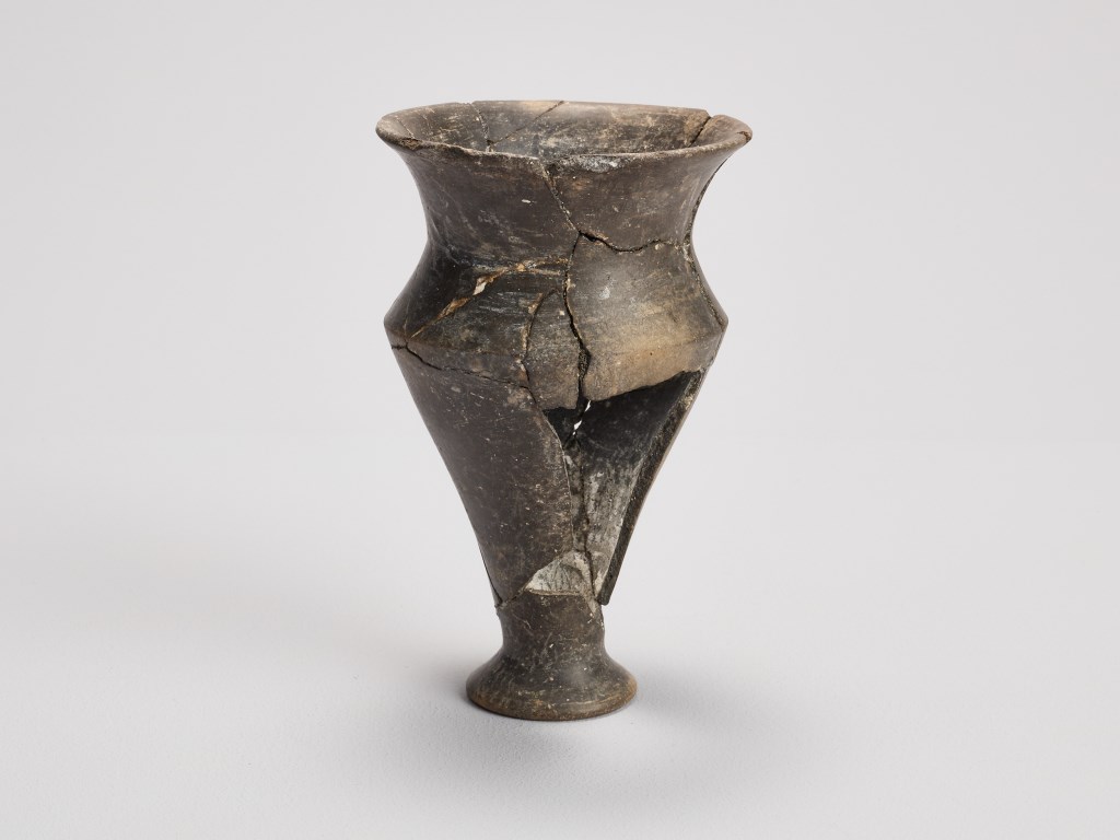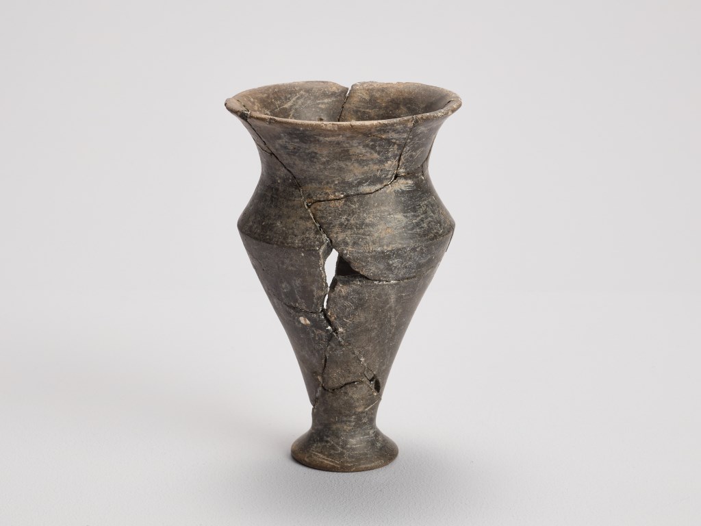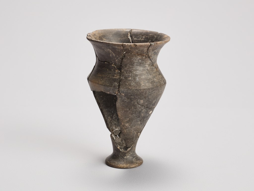 Gobelet caréné (Demoule, type 5722) en terre cuite noirâtre non tournée, lissée et sans décor. Le pied est étroit et creux et la lèvre est évasée