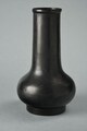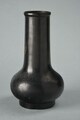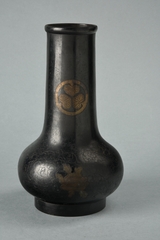 Vase en alliage cuivreux à panse ovoïde et col haut, sur socle. Le col est orné d’un médaillon doré présentant un emblème figurant une triple rose trémière (famille Tokugawa). Un bourrelet compose le sommet du col. Sur la panse, un décor d’arabesques végétales appelées karakusa (« herbe chinoise ») entoure au centre une fleur de pivoine