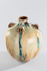 Vase, assise annulaire, panse ovoïde, épaulement souligné de quatre petite anses, col tronconique, au décor de coulures brunes et bleues sur fond gris finement cristallisé.