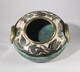Ce vase accompagne l’ensemble de la dation Fels. Il forme une paire avec un autre vase exposé lui aussi dans le salon de l’hôtel de Fels. Il arbore forme ronde aplatie à deux anses en ressaut, dont le col resserré laisse l’espace nécessaire au déploiement du décor disposé de façon cinétique. Deux figures féminines aux positions comme dictées par la forme du vase sont respectivement flanquées de deux oiseaux et de deux biches qui se détachent du fond beige craquelé d’or. La partie inférieure du vase est recouverte d’un émail vert contrasté d’ombres plus sombres évoquant les profondeurs aquatiques. Les anses et le bord du col sont recouverts d’une dorure patinée. Qualifiées de « céramiques de peintre », les œuvres de Jean Mayodon témoignent de la maestria avec laquelle il traitait ses décors à l’érotisme latent. Recouvrant complètement les vases, le décor tend à faire oublier l’objet, comme si l’artiste déposait une image en trois dimensions de la nature mystifiée sur un meuble du salon. Ces deux vases illustrent la veine néoclassique des décors figurés coexistant avec le reste du décor. [M. Clerc Baranzelli, 2022]