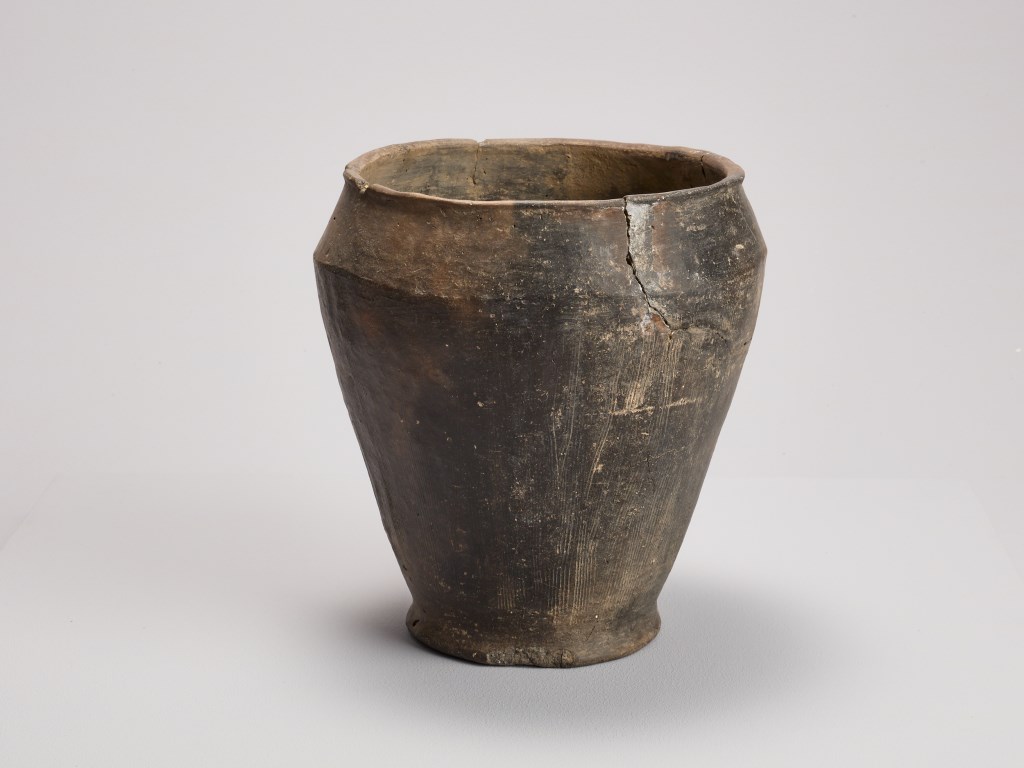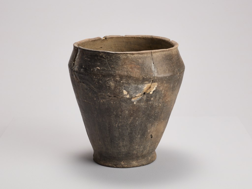 Situle classique (Demoule type 54211) en terre cuite grisâtre, non tournée et bien lissée avec un décor fait d’incisions faites avec un peigne. La carène est haute et vive, la lèvre est renflée et légèrement éversée