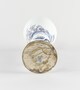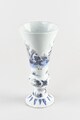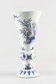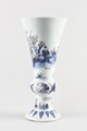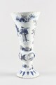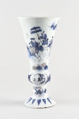 Vase cornet à pied individualisé, assise plate, bague renflée, élancé et évasé à l’ouverture, lèvre arrondie, au décor bleu-blanc en registres superposés consistant sur le pied en une frise de feuilles, au dessus lettré assis dans un paysage, sur la bague alternent trois médaillons ovales avec des motifs végétaux figurant respectivement des constructions près de la côte à proximité de laquelle vogue un voilier, deux chinois assis sur fond de paysage et une marine, sur le registre principal, deux chinois assis près desquels se tient un page tenant une ombrelle, serviteur et guerrier sur fond de paysage ; petits paysages encadrant en haut et bas la scène.