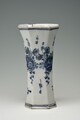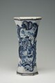 Vase cornet de section octogonale, base et col évasés, assise et lèvre soulignées par un liseré, orné d’un cartouche rocaille aux contours découpés en relief enrichis de fleurs figurant un pêcheur, en pied, sur la rive, accoudé à sa barque, tenant une longue canne, sur fond de paysage aquatique, cartouche duquel partent des tiges fleuries.