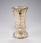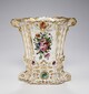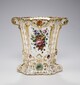 Vase de mariée, d’allure trapézoïdale, bord et pied chantournés, paroi évasée, au décor polychrome (vert, rose, violet, jaune, rouge, bleu et doré) de bouquets floraux, d’arabesques, de motifs végétaux stylisés, et imitations peintes de pierres précieuses enchâssées.