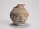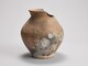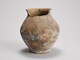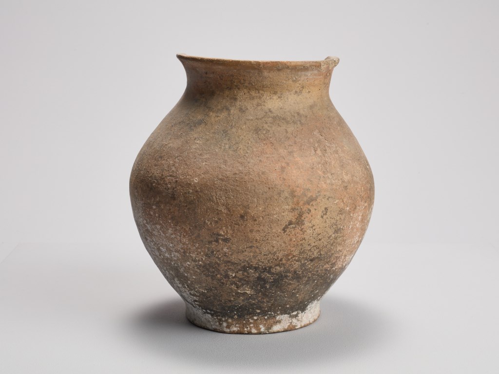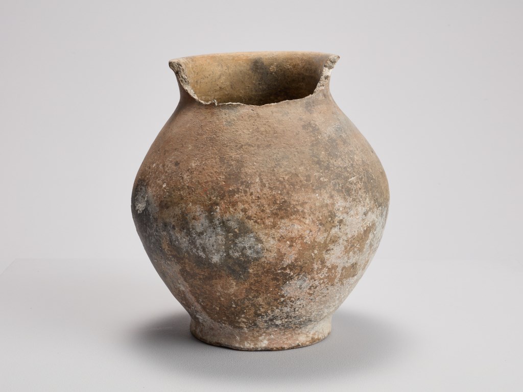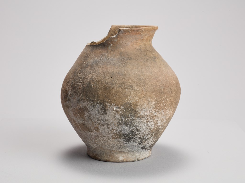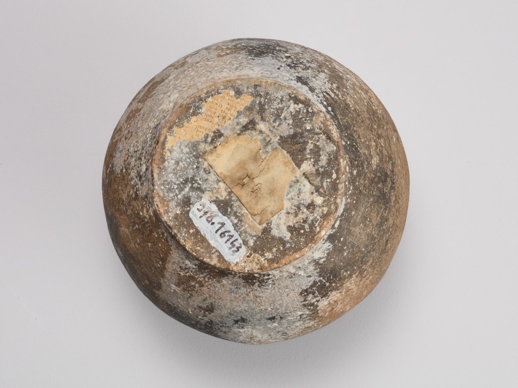Céramique en terre cuite brun-gris, à fond plat dégagé de la panse, col évasé, lèvre déjetée sur l’extérieur, mais facettée à l’intérieur. La panse présente des coups de feu accompagnés d’écailles sur ces plages noircies. Le dépôt de craie sur le bas de panse indique que le vase s’était couché sur le côté dans la sépulture [Charpy, Lambot, Poulain, 2021]