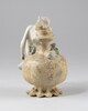 Vase en forme de pavot, piédouche, à col élancé, décor polychrome (vert, jaune et orange) en relief se composant d’une femme nue assoupie sur la capsule d’un pavot entourée de part et d’autre de têtes humaines