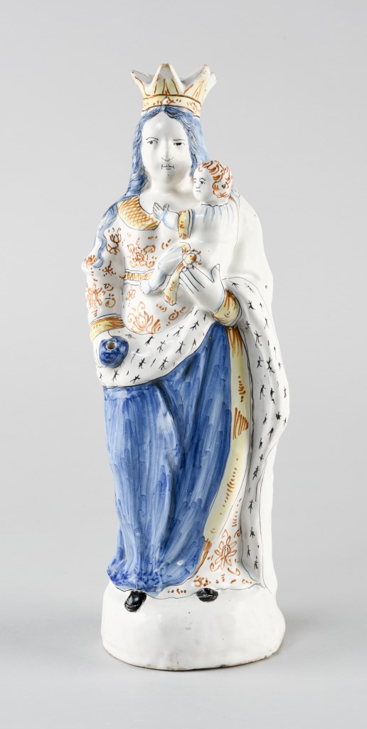Vierge à l’Enfant couronnée, sur une terrasse, en pied, hanchée, jambe droite en avant, vêtue d’une robe aux motifs floraux, drapé à doublure d’hermine, main droite contre la hanche destinée à accueillir un attribut manquant, tenant l’Enfant à gauche, vêtu d’une tunique, de profil, accroché à sa mère.
