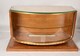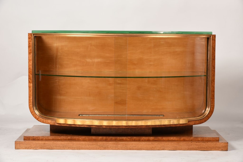 Bois massif, placage de loupe d'Amboine, placage peuplier (intérieur), laiton doré; verre (portes coulissantes et étagères), bois doré, système d'éclairage avec néon en verre dépoli.H x L x P en cm : 81,5 x 149,8 x 62,5