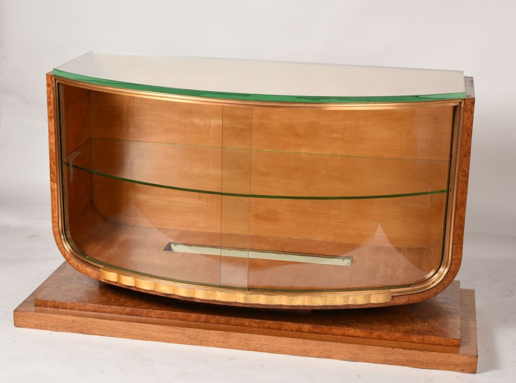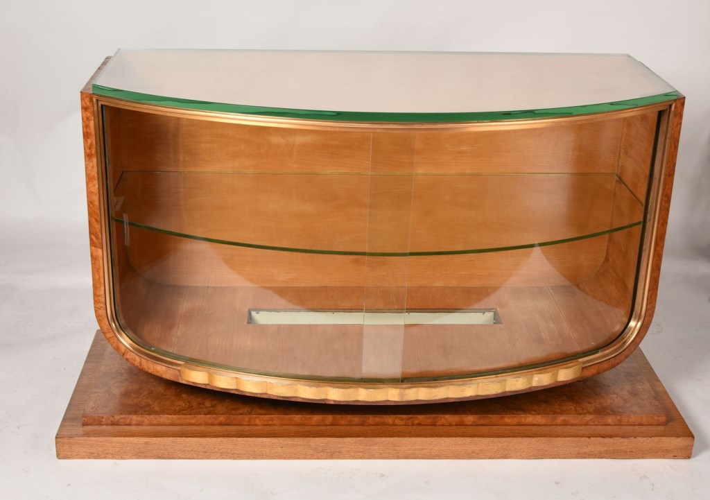 Vitrine lumineuse de section semi-circulaire, base à gradins, moulure en bas, deux verres cintrés coulissants, préhensions, plateau de verre ; éclairage depuis une cavité rectangulaire en bas recouverte d’une plaque de verre détachée ; quatre taquets destinés à accueillir un plateau intermédiaire.