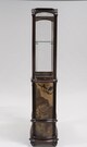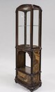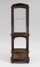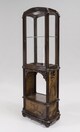 Vitrine élancée, à la partie supérieure cintrée fermée par quatre vitres, niche médiane ouverte sur deux côtés, écoinçons ornés de motifs végétaux, partie inférieure fermée au moyen d’un vantail mobile muni d’une entrée de serrure, bandeaux moulurés, pieds consistant en escargot, placage de noyer en face interne, registres marquetés en face externe ornés d’espèces végétales et florales dans leur environnement, parfois boisé, parfois montagneux ; quatre supports d’étagère bifides.