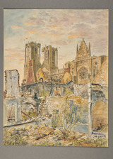 - Vue de la cathédrale de Reims prise du Sud-Est à travers les ruines