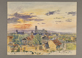 Vue panoramique d’une ville en ruines avec, au centre en arrière-plan, une cathédrale et, à gauche, une église paroissiale.